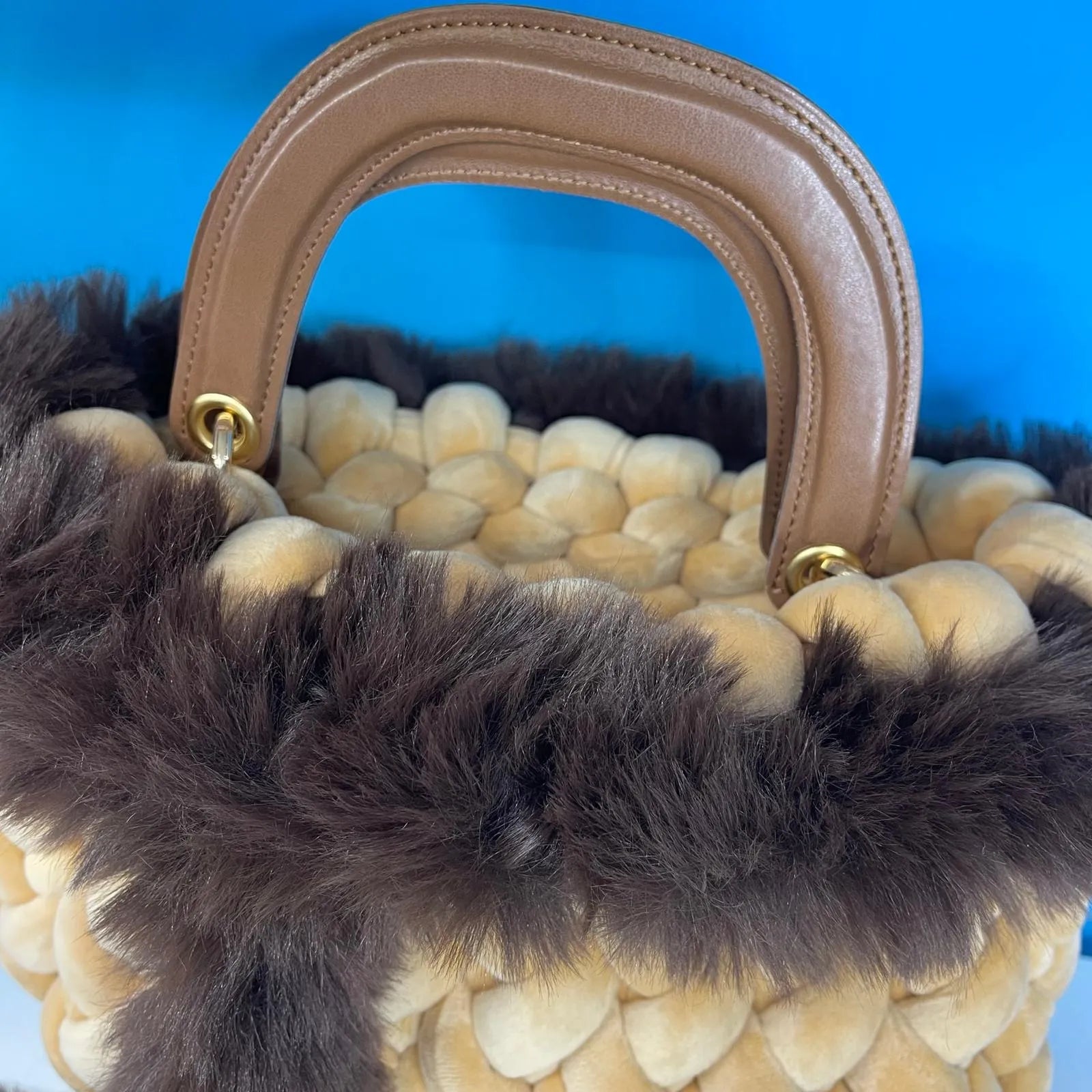 Borsa Marshmallow in Velluto con Pelliccia e Manici in Pelle