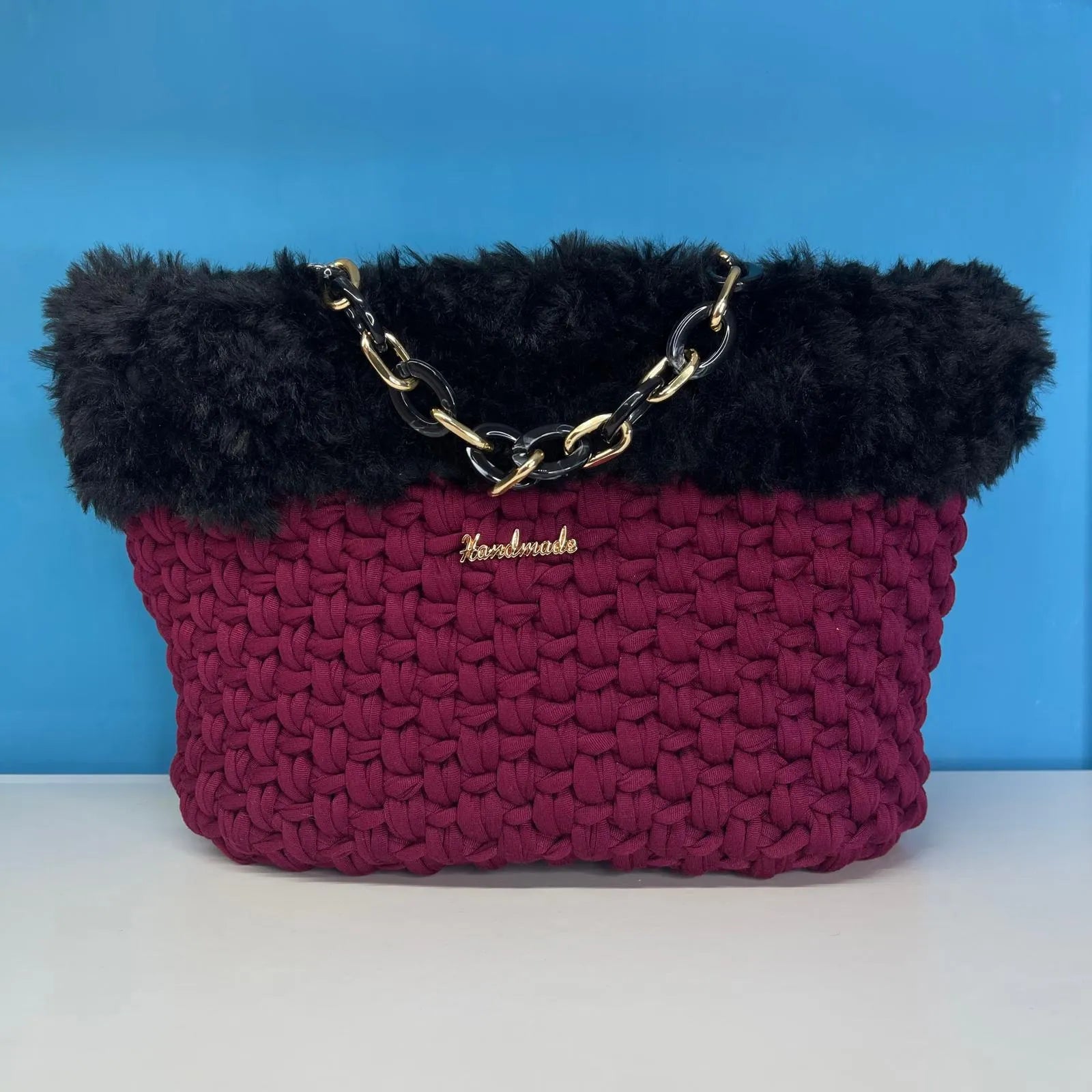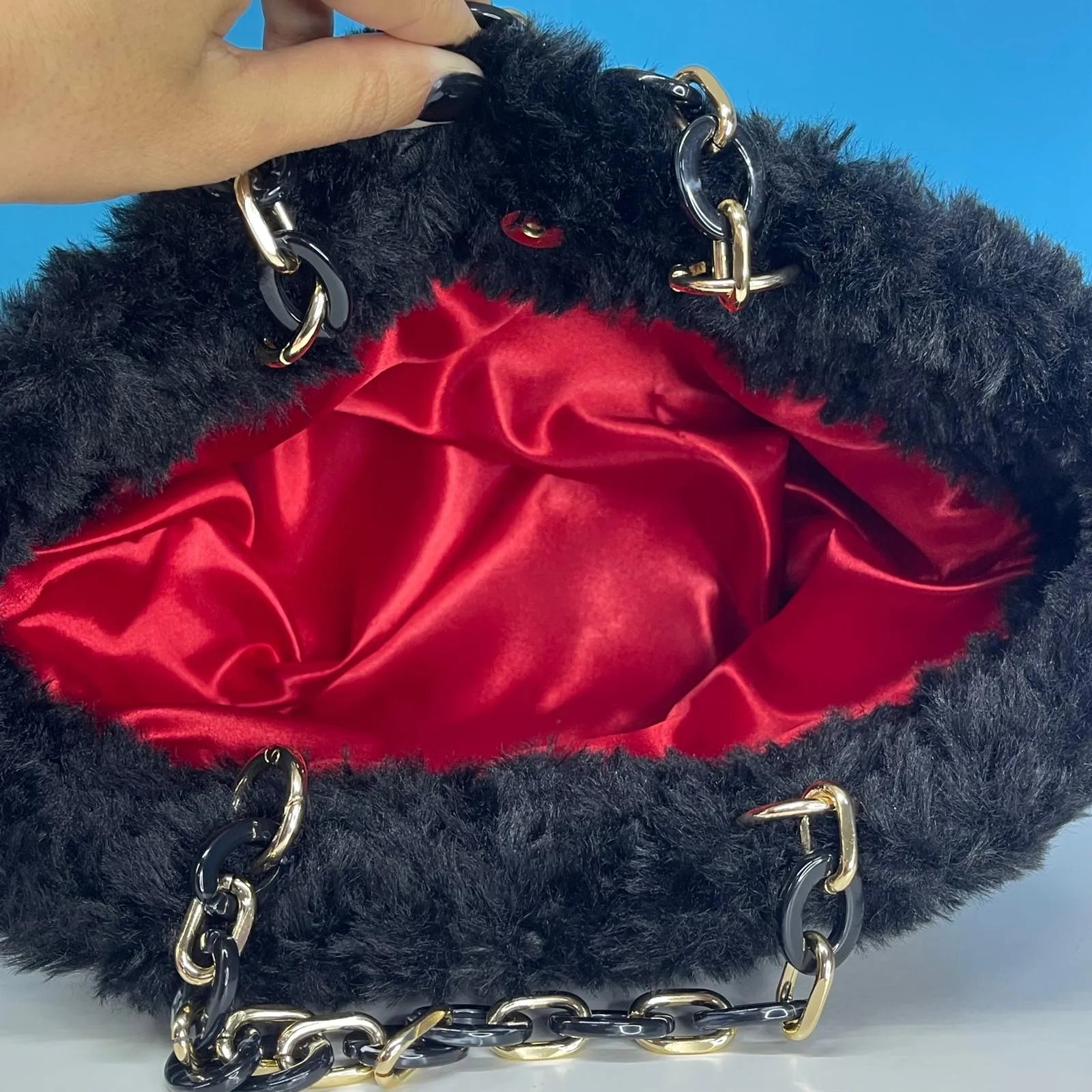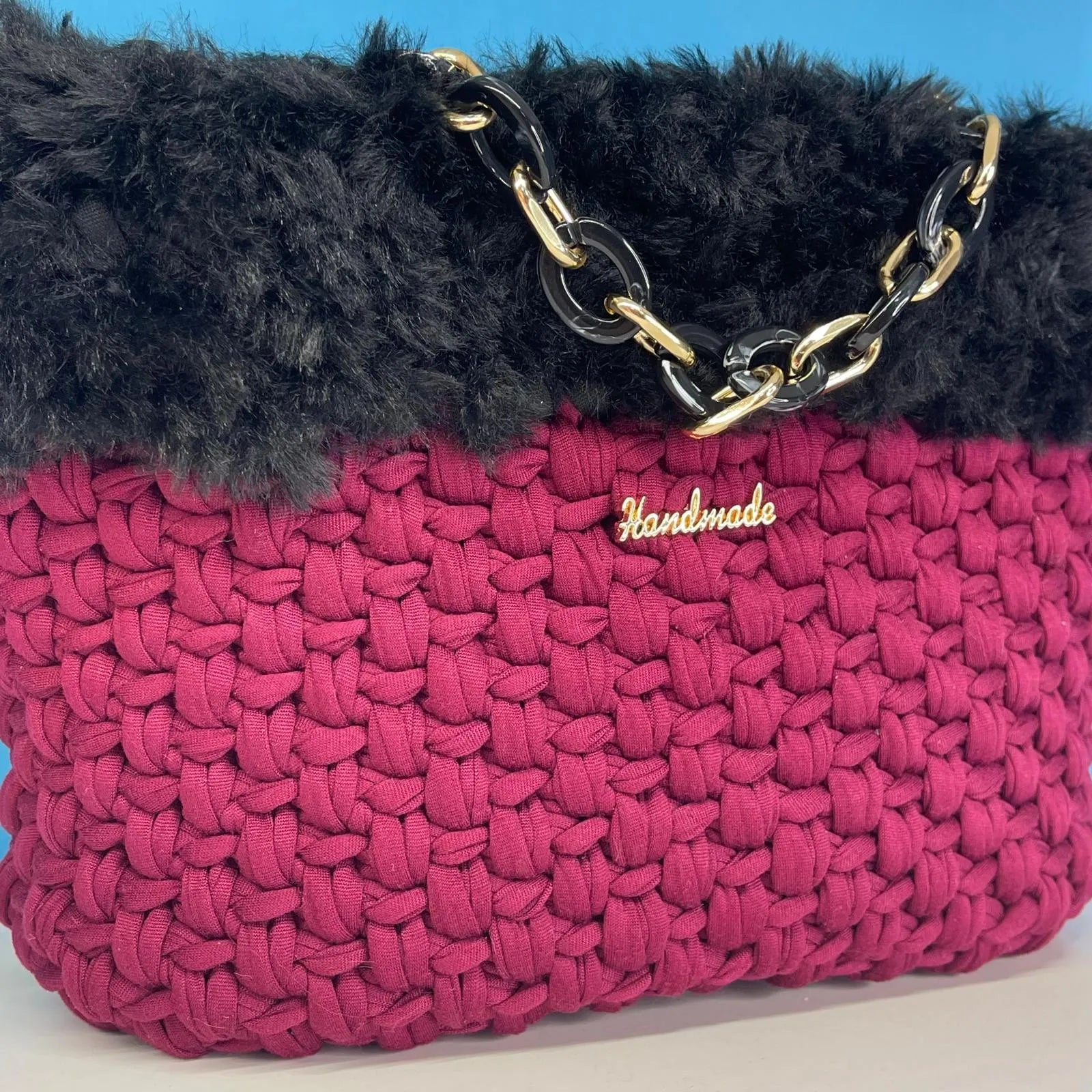 Borsetta in Fettuccia Bordeaux con Pelliccia Nera e Manico Catenina