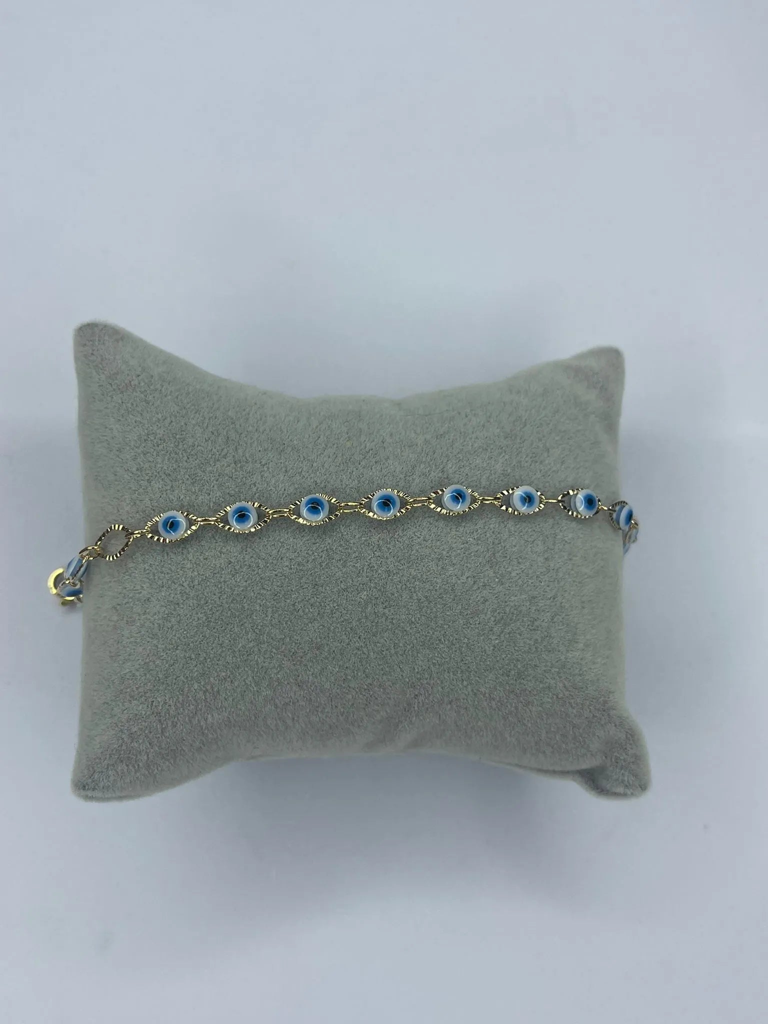 Bracciale elegante realizzato in acciaio inox di alta qualità, che garantisce durabilità e resistenza nel tempo. Il design affascinante dell'occhio turco in silver aggiunge un tocco di mistero e protezione al tuo polso. Perfetto per chi ricerca un accessorio versatile che combina stile contemporaneo con significati simbolici. Indossalo quotidianamente senza preoccupazioni: l'acciaio inox resiste all'ossidazione e mantiene il suo splendore brillante. Un bracciale che non passa inosservato, ideale per completare qualsiasi look con personalità e fascino.